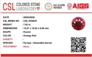 This garnet is completely unheated and untreated, maintaining its natural structure and color. Certification by CSL – Colored Stone Laboratory confirms its identity and authenticity, providing confidence for buyers and collectors.