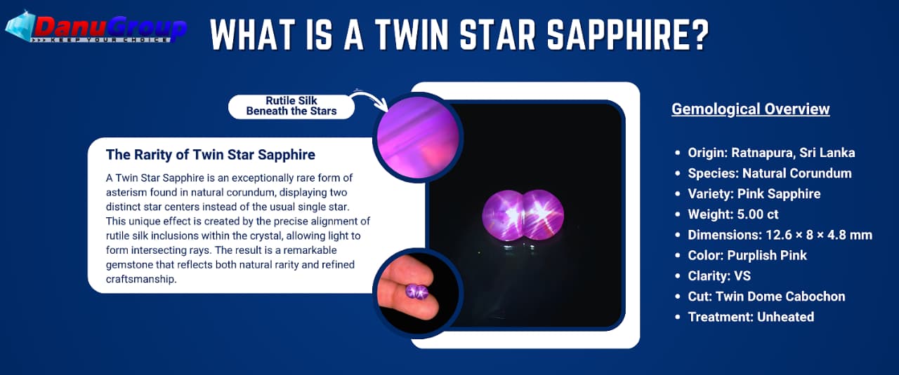 A Twin Star Sapphire is one of the rarest expressions of asterism found in natural corundum. Unlike standard star sapphires that display a single six-rayed star, this phenomenon reveals two distinct star centers on a single cabochon surface. This effect is created by exceptionally aligned rutile silk inclusions within the crystal structure, combined with a rare natural orientation of the rough stone.